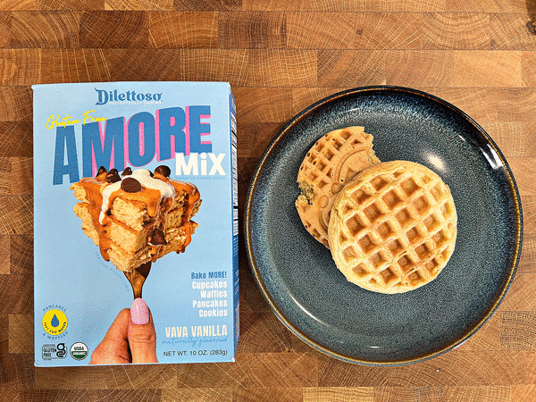 One 10-ounce box of the Amore mixes — Italian for "love" — makes around 15 4-inch mini waffles or a half-dozen 7-inch regular waffles.