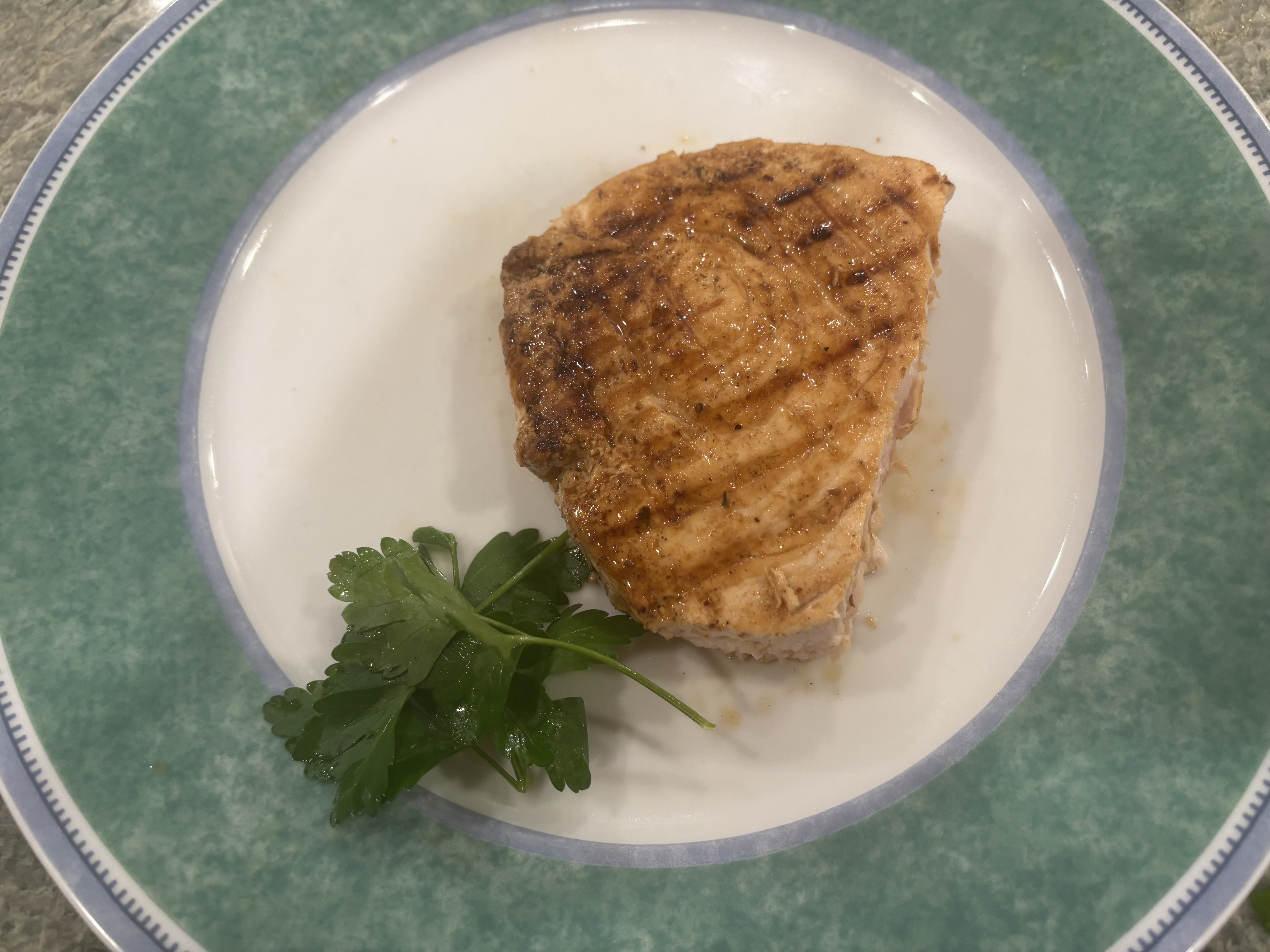 4. Heat remaining marinade in a small saucepan over medium heat. Pour some of the remaining marinade over each steak. Garnish with parsley springs. serve immediately