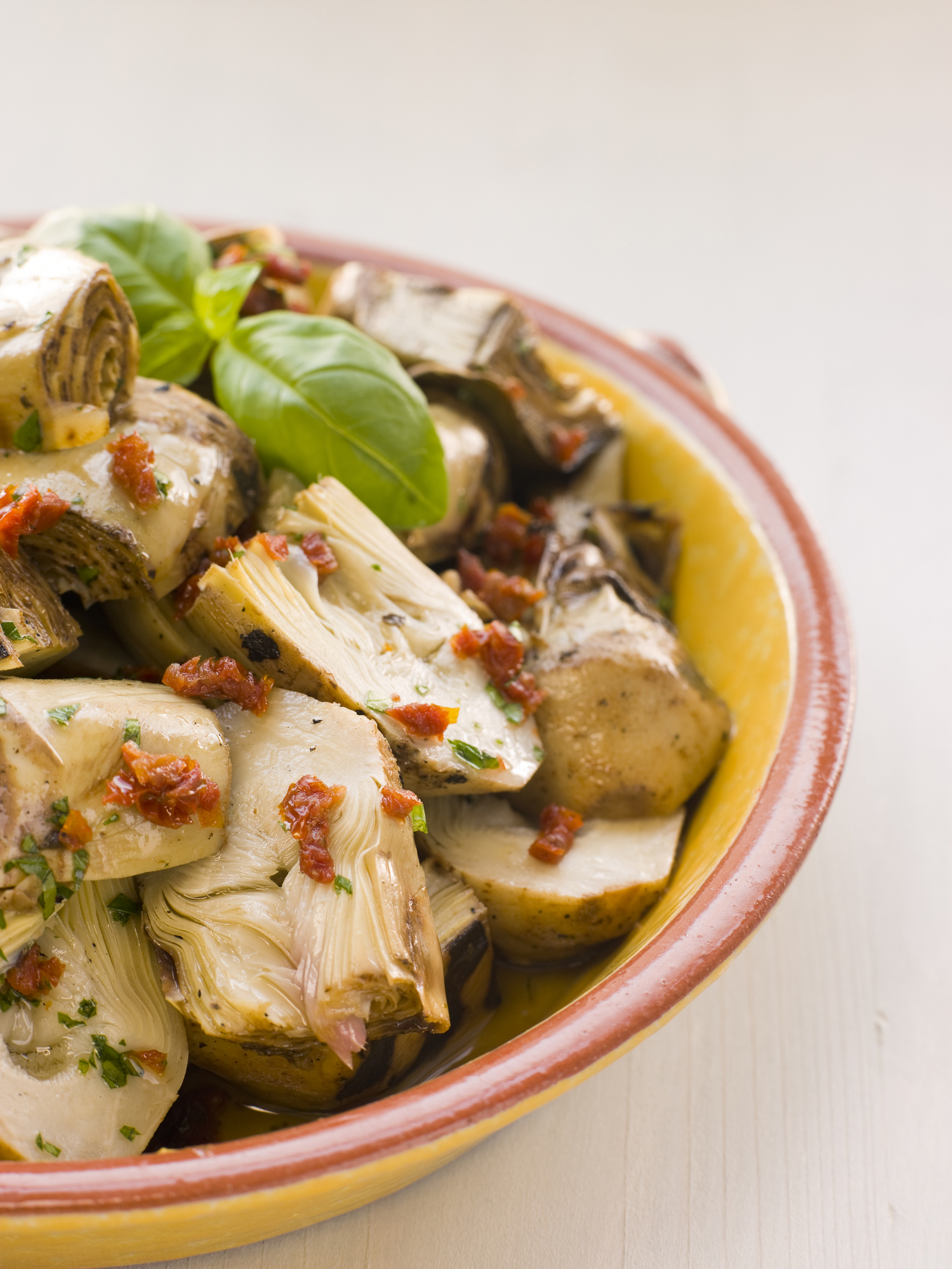 This recipe features baby globe artichokes, which are about two inches long and grow on the lower branches of the same plant as large globe artichokes. The shade keeps these artichokes small. After removing the tough outer leaves, the tender inner quarters can be eaten. Baby artichokes are ideally served hot alongside grilled entrees or chilled as appetizers and first courses. They pair well with olives, roasted peppers, and crackers.