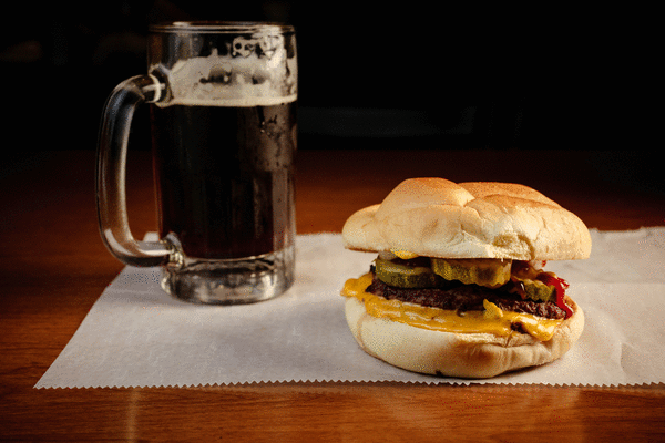 The double cheeseburger includes two patties (thinner style, 2 ounces or so each of 85% lean beef) seared fast on a hot griddle, with American cheese on a kaiser roll. You top it yourself, traditionally with pickles, onions, ketchup and mustard. There’s also relish (not neon green) on the topping bar, plus salt and pepper (most importantly to me).