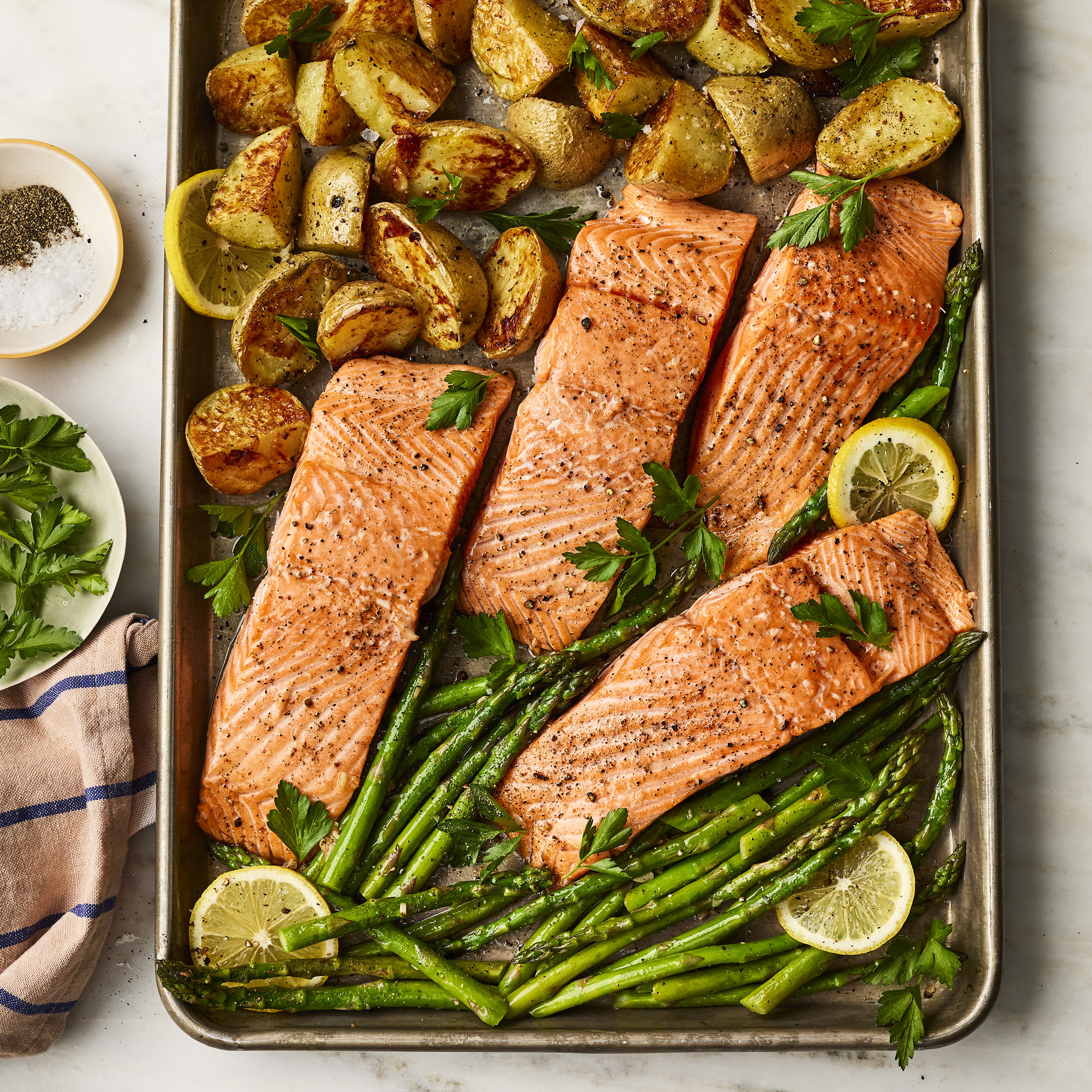 3. Sprinkle salmon with the remaining 1/8 teaspoon salt. Move the potatoes to one side of the pan. Place the salmon in the center of the pan; drizzle with the butter mixture. Spread the asparagus on the empty side of the pan. Roast until the salmon is just cooked through and the vegetables are tender, 10 to 12 minutes. Garnish with parsley.