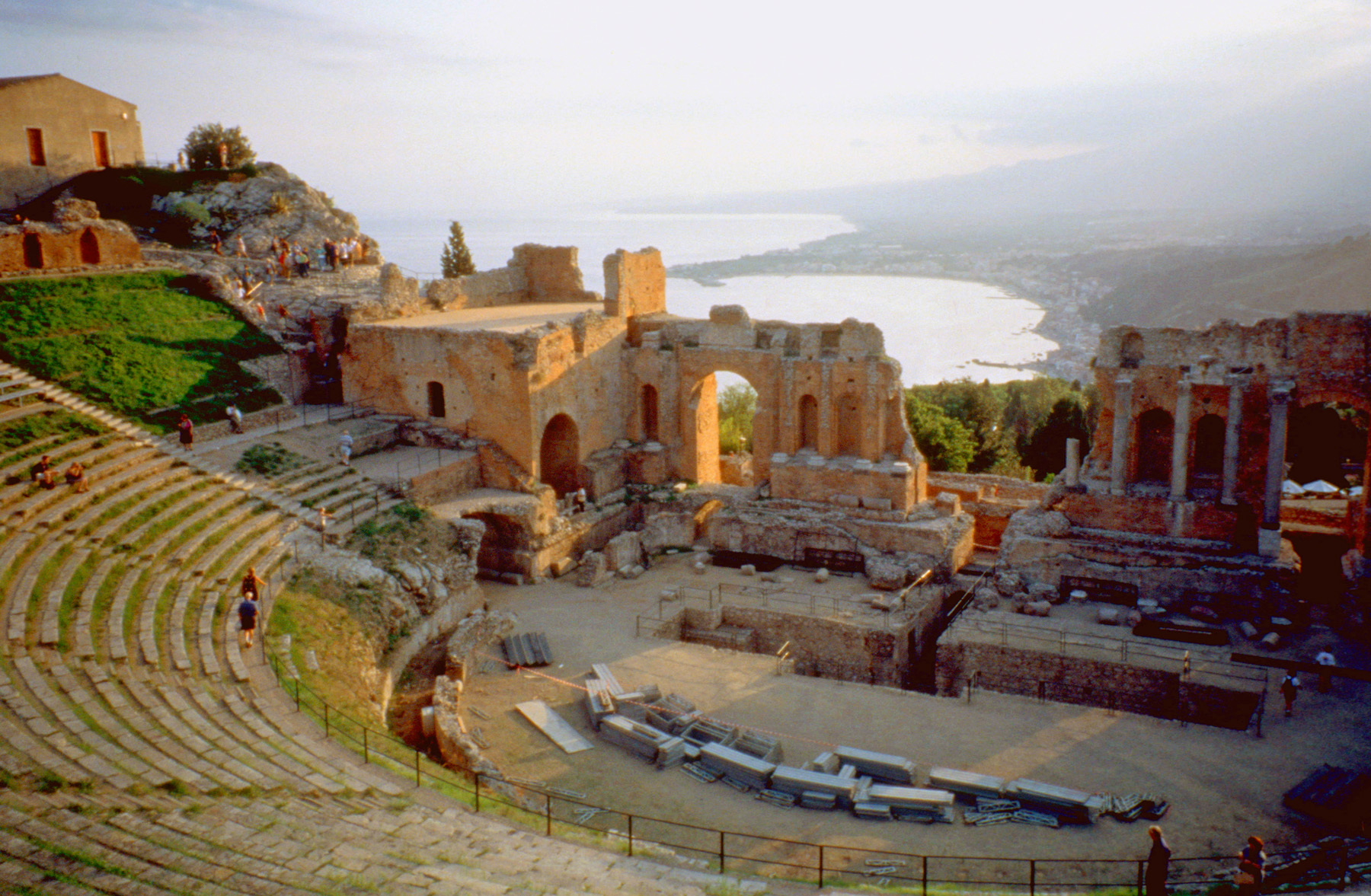 At the edge of the volcano, I surveyed the island. Old lava flows rumbled like buffalo toward teeming Catania. The island's sprawling second city butted up against a crescent beach, which stretched all the way to Taormina -- Sicily's romantic cliff-side haunt of aristocrats at play. And to my right was the hazy, high, and harsh interior.