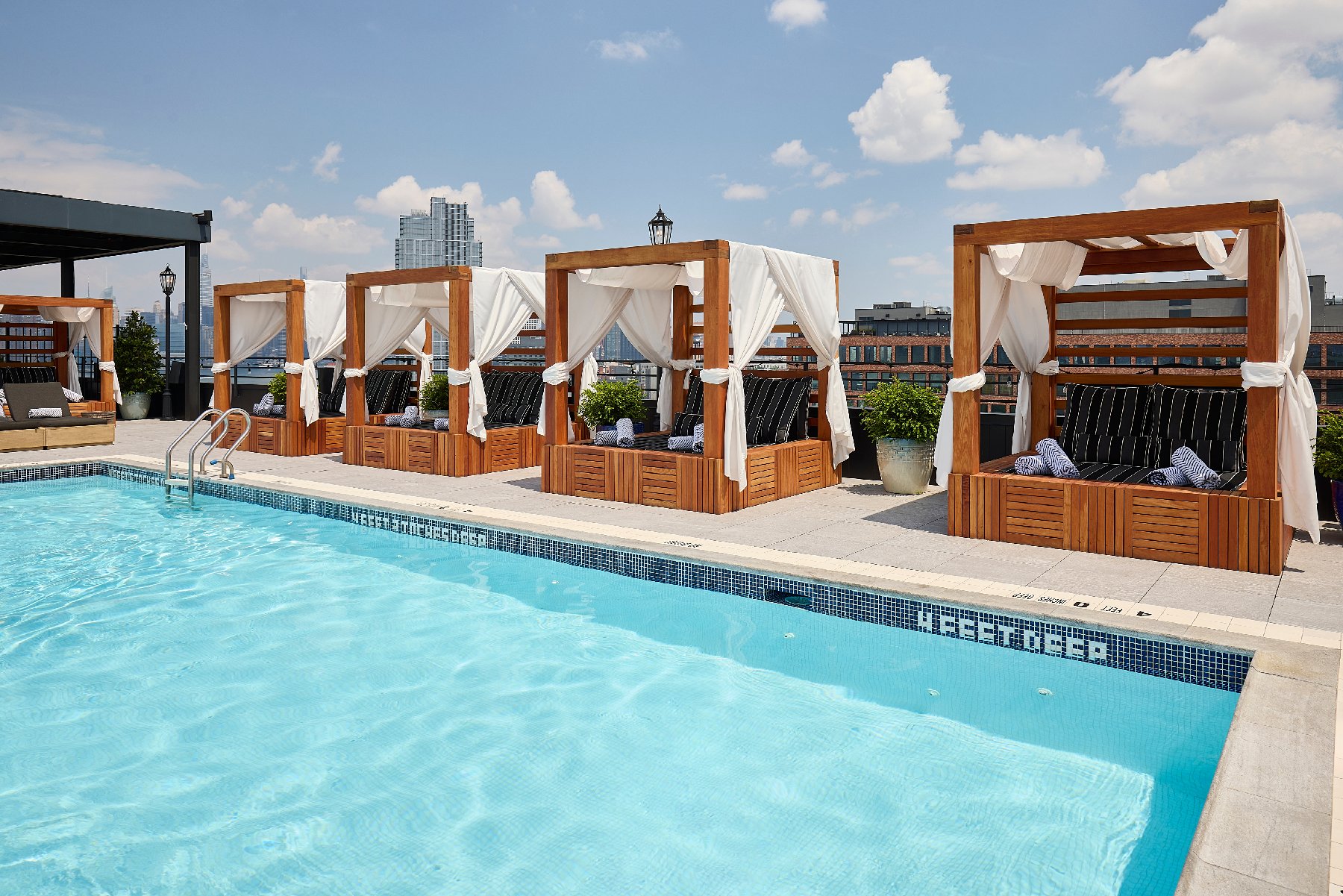 People travel far to gaze in awe at the New York City skyline, and there are few more dramatic views than that from the rooftop pool deck at the Arlo Williamsburg Hotel in Brooklyn. A dramatic Water Tower Bar overlooks the pool and poolside cabanas. Guests of the property can book a complementary pool time slot, and others can make a reservation through resortpass.com.