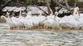 It's another species of water birds that gives White Pelican Island off Florida's Gulf Coast its name. Every fall and winter, this tiny islet is swarmed by thousands of white pelicans from as far away as western Canada. Those long-distance flyers have the largest wingspan of any bird in North America, an impressive 9 feet, and are one of the heaviest flying birds on earth, weighing up to 20 pounds. Their unique feeding technique is a group effort. Adults form a circle and flap their wings against the water to herd fish into the center, where they can be easily plucked and devoured.