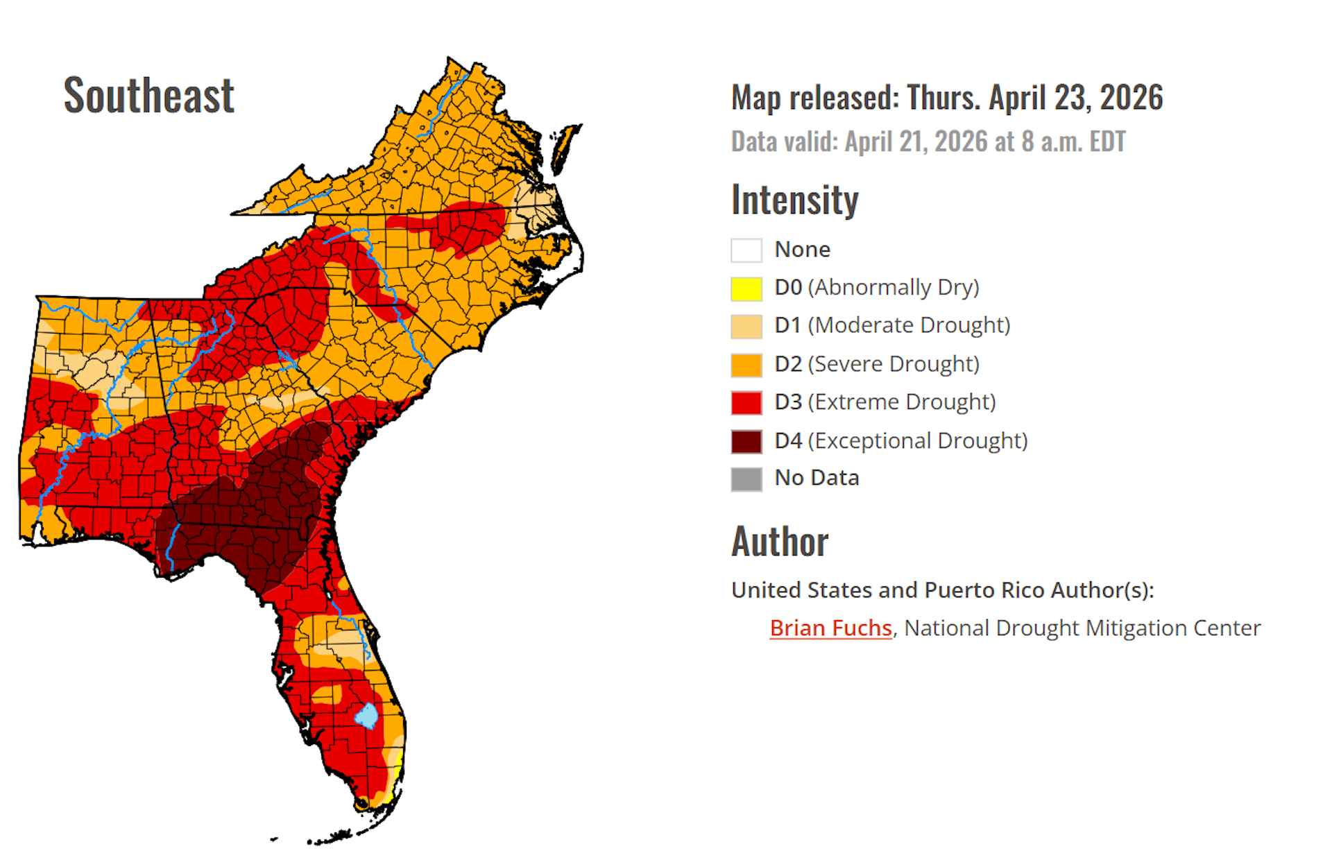Much of the Southeast has been in a drought since July 2025. From mid-March to mid-April 2026, the region saw less than a quarter of its normal precipitation for that time of year.