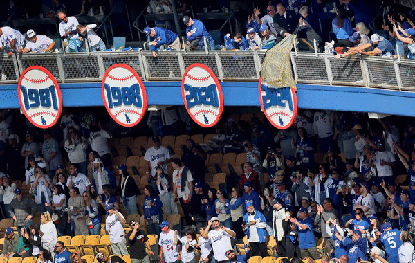 Eight baseball-shaped signs sported their years — 1955, 1959, 1963, 1965, 1981, 1988, 2020, 2024 — while a ninth was still shielded by a blue cover, with plenty of room along the stadium’s club level for more.