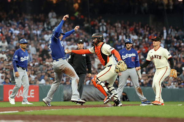The Giants recorded the second out of the inning when Freddie Freeman, the runner on third, broke home on a grounder hit right at Devers. Devers fired a throw home and catcher Patrick Bailey chased Freeman back to third base before tagging him for the out.