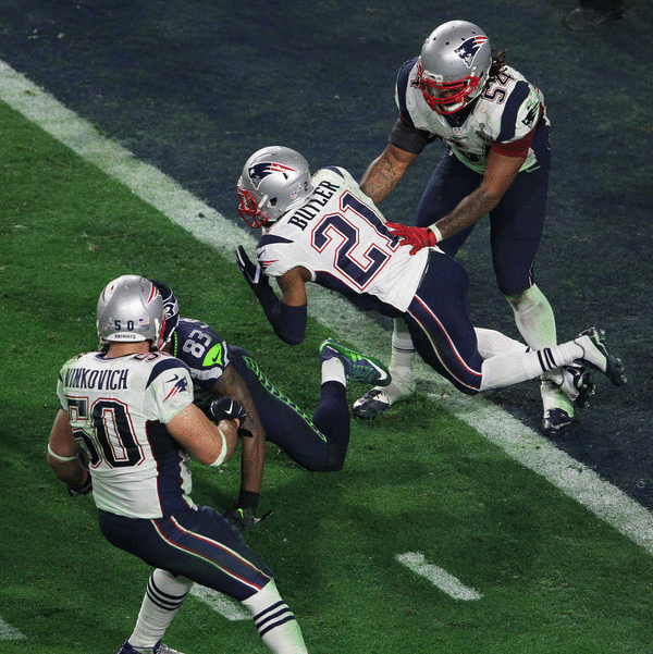 Seattle had the ball on second-and-goal on the 1 with 26 seconds left while trailing New England 28-24. Then, Russell Wilson threw a pass intended for Ricardo Lockette that Butler picked off at the goal line.