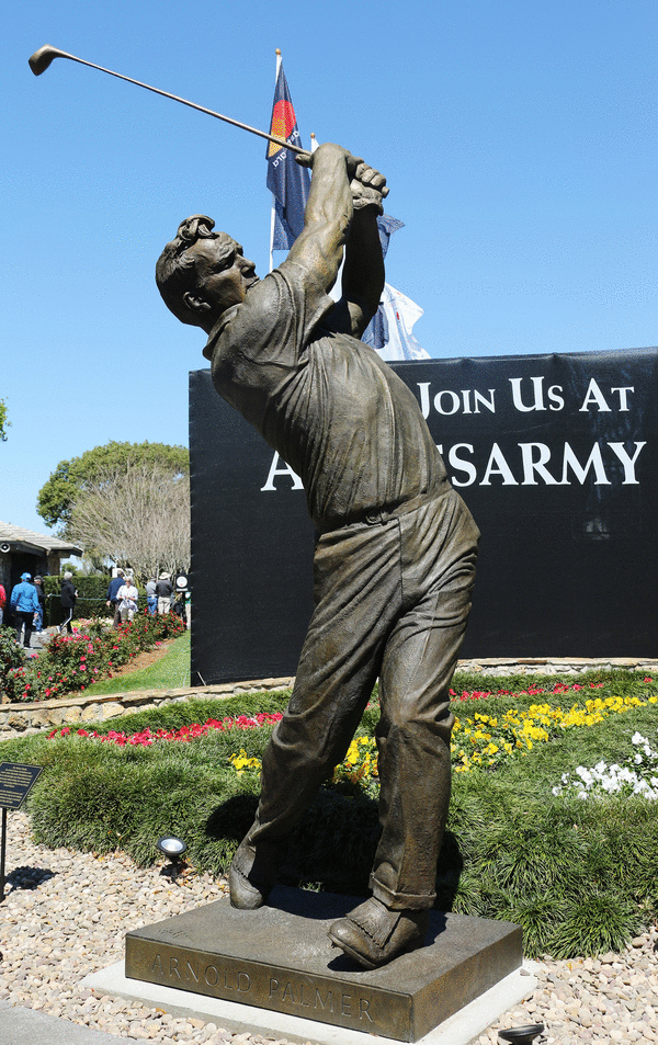 ORLANDO, Fla. — I stood beneath the massive 13-foot bronze statue of Arnold Palmer at Bay Hill earlier this week and looked up at The King frozen in his signature finish; those mighty forearms extended, chest high, belt buckle facing the target, spine arched in that unmistakable “reverse C” follow-through that once sent tee shots screaming down fairways and sent Arnie’s Army into euphoric roars.