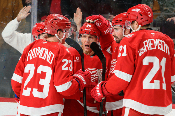 Axel Sandin-Pellikka, J.T. Compher and Lucas Raymond (also two assists) added goals — James van Riemsdyk assisted on two goals — and goaltender John Gibson stopped 25 shots as the Wings (26-15-4, 56 points) won their second consecutive game after a disappointing two-game series against Pittsburgh (one of four possible points earned).