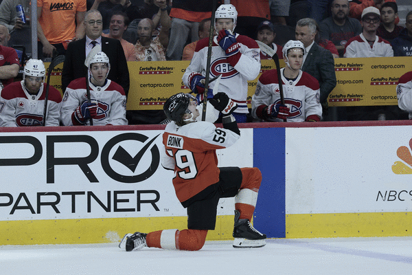 The Russian winger picked it up, and while two Canadiens tried to go after McDonald, he sent it over to Bonk. The Flyers defenseman glided down a few feet and sent a wrister past Dobeš with Luke Glendening heading to the net to create some havoc just in case.